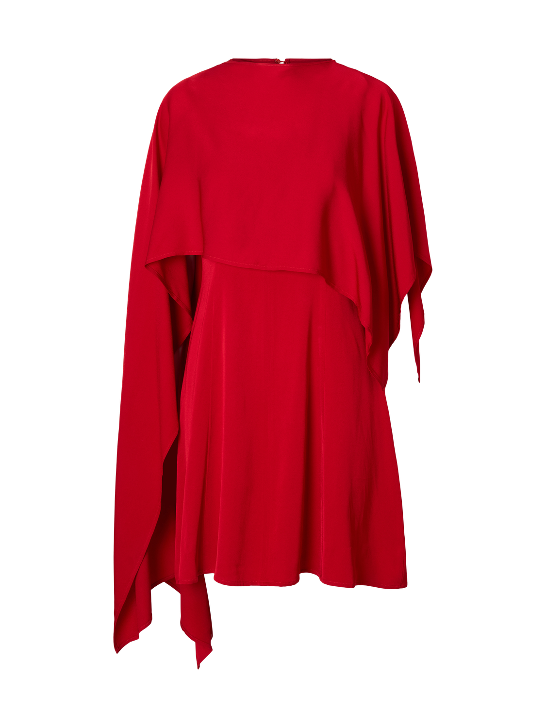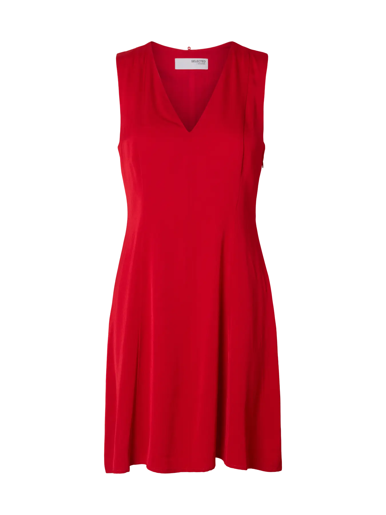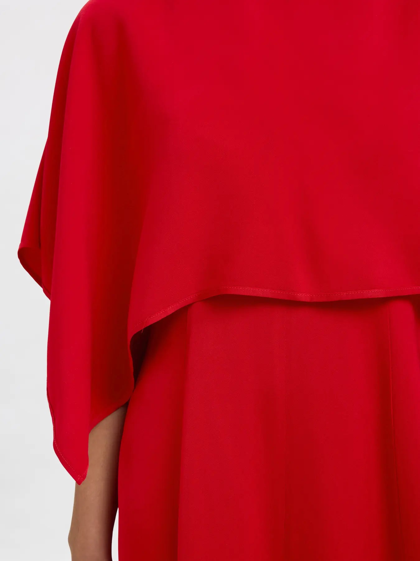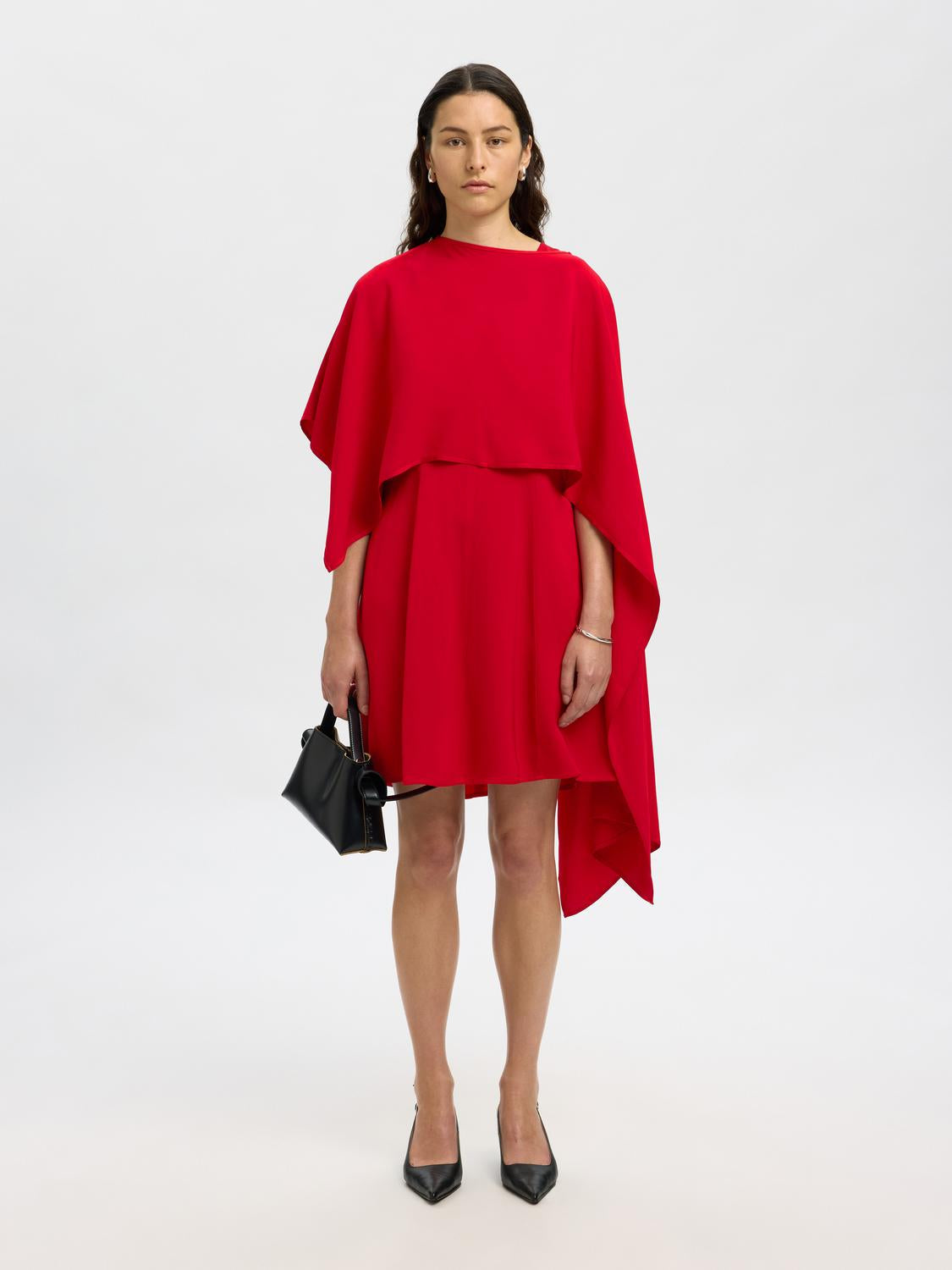 Kort kjole fra Selected Femme med v-udskæring og brede stropper. Det løse, kappe-lignende overlag på bagsiden gør kjolen ideel til bryllupper og gallamiddage, hvor den dybe røde farve skaber et markant udtryk.