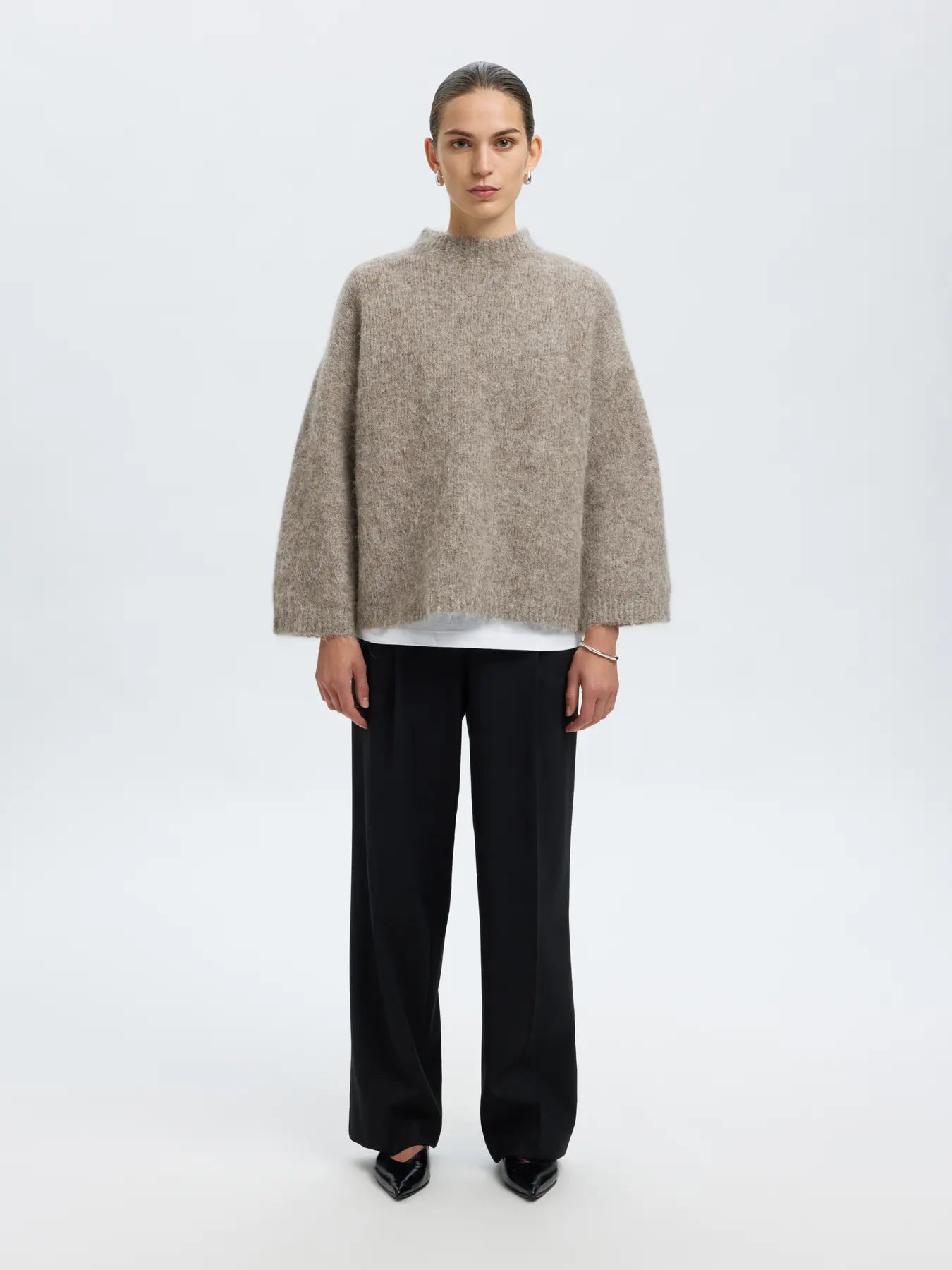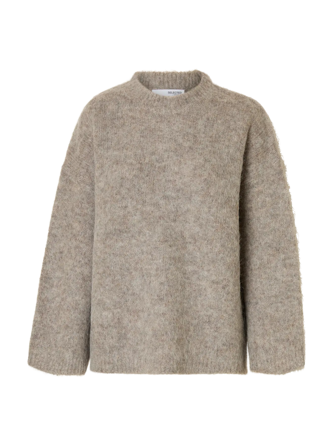 Striktrøje fra Selected Femme med høj andel af certificeret alpakauld, der giver en blød og varm fornemmelse. Den fnuggede tekstur og afslappede pasform gør den ideel til hyggelige dage derhjemme.