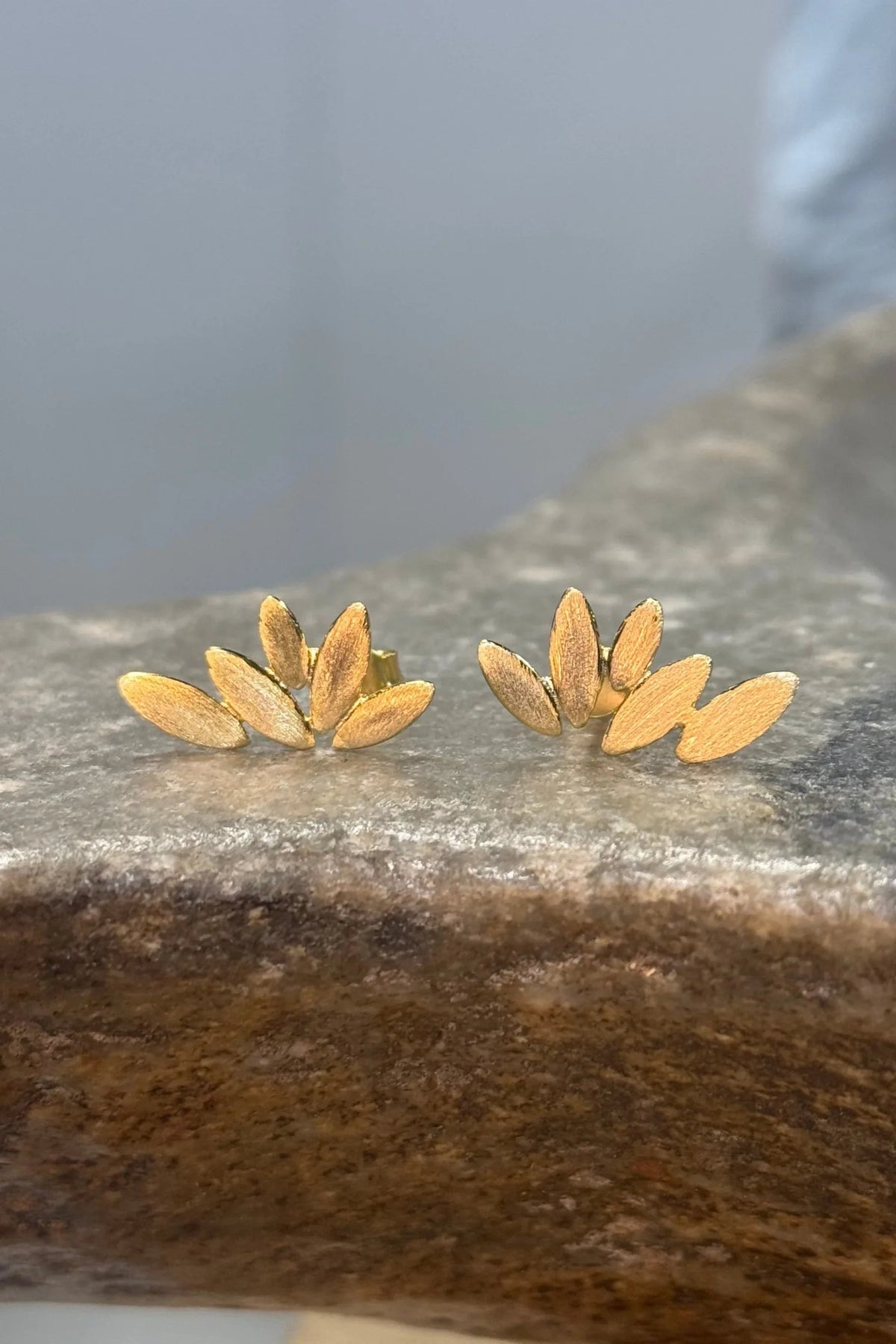 Guldbelagte øreringe med blomsterdesign, overlappende blade og tekstur på en stenet overflade.