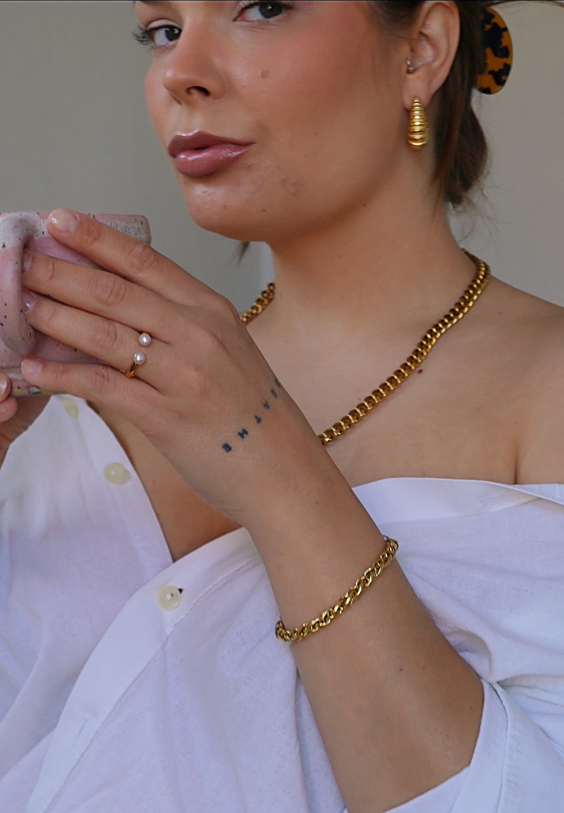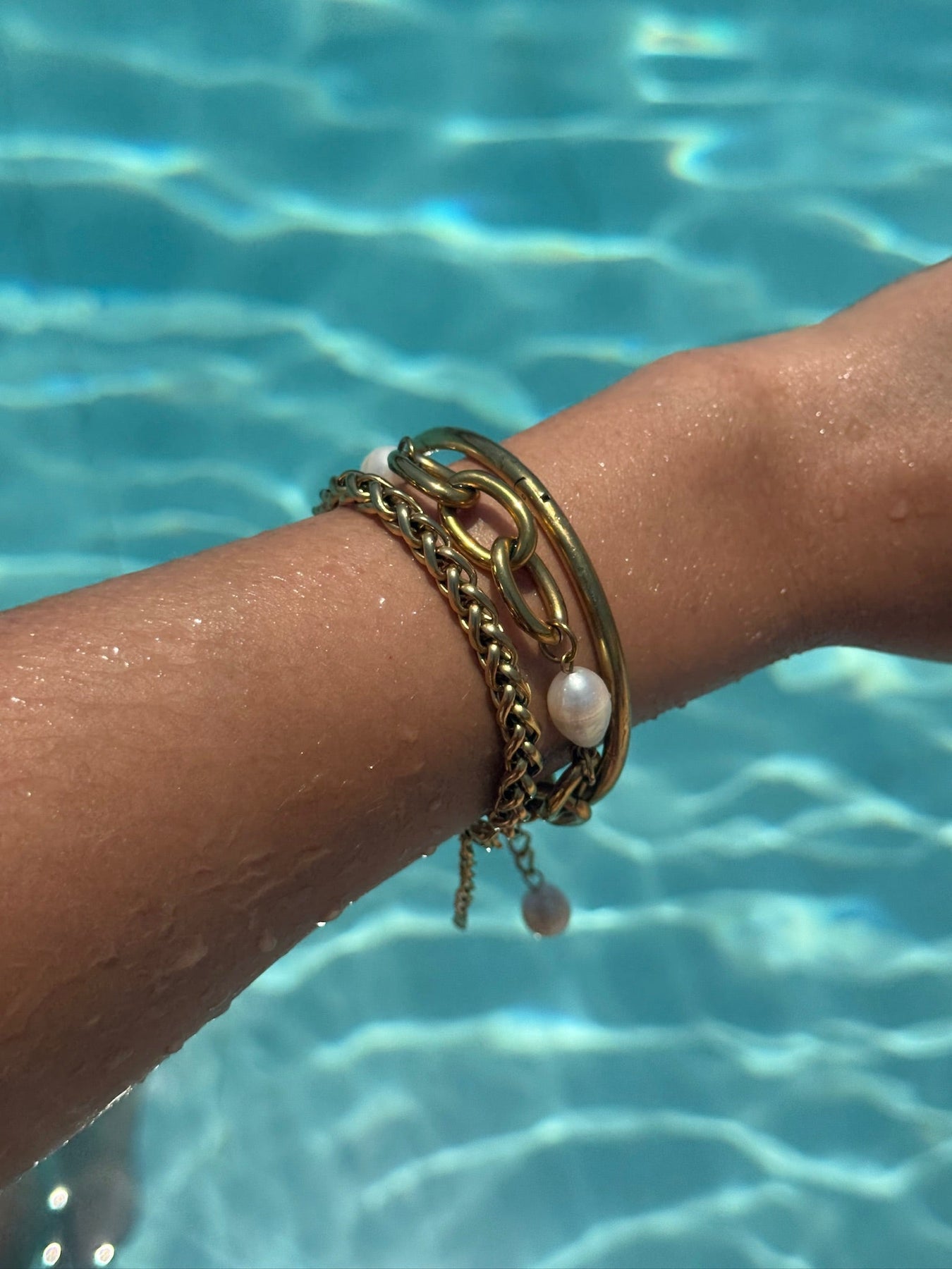 Dette kædearmbånd med 18 karat guldbelægning er skabt til dig, der ønsker et smykke til både hverdag og fest. Armbåndet har justerbar længde og er både vandtæt og nikkelfrit.
