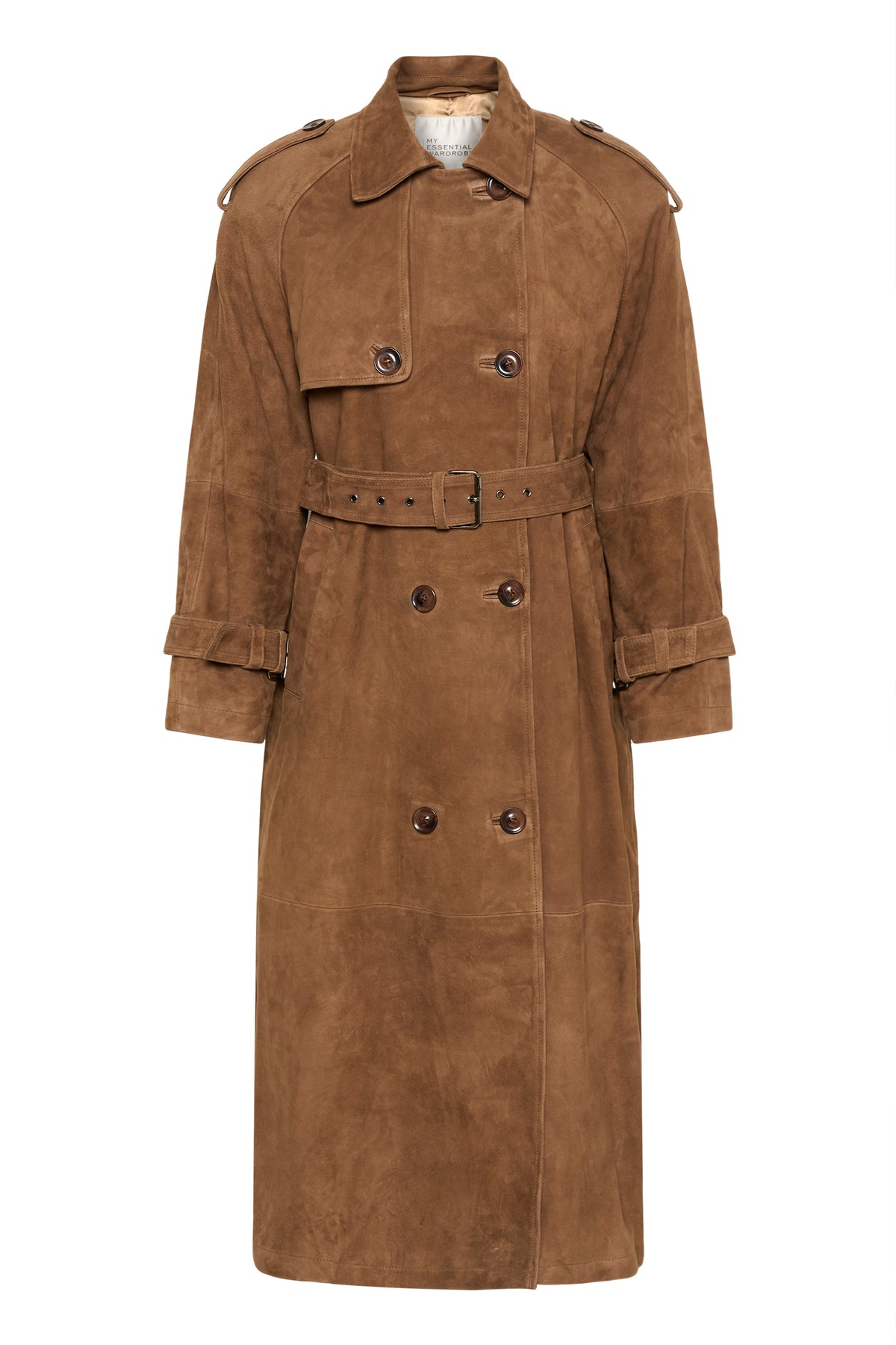 Dobbeltknappet trenchcoat fra MY ESSENTIAL WARDROBE med midi-længde og løs pasform. Designet med skulderpuder, justerbart bælte i taljen og praktiske spænder ved manchetterne.