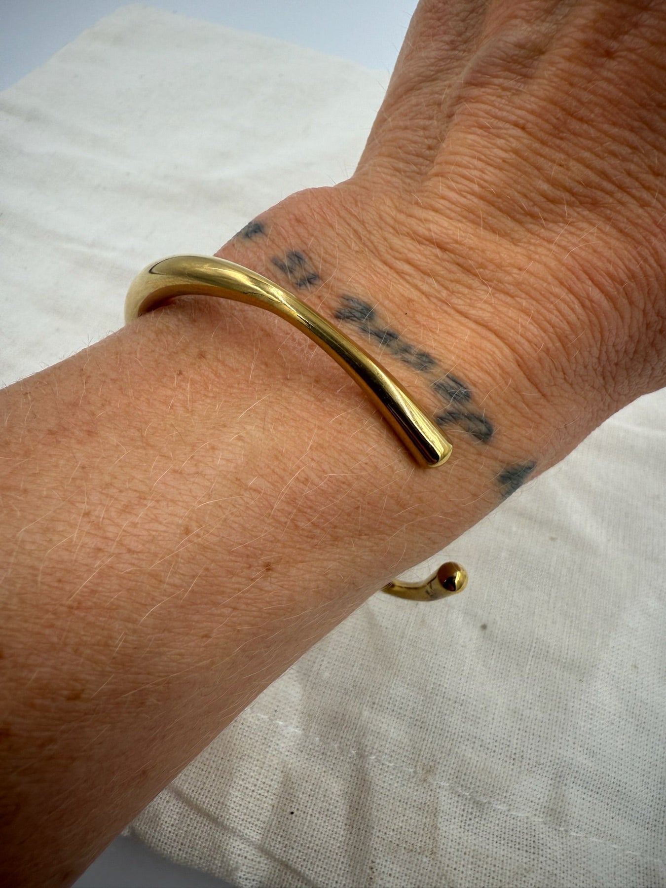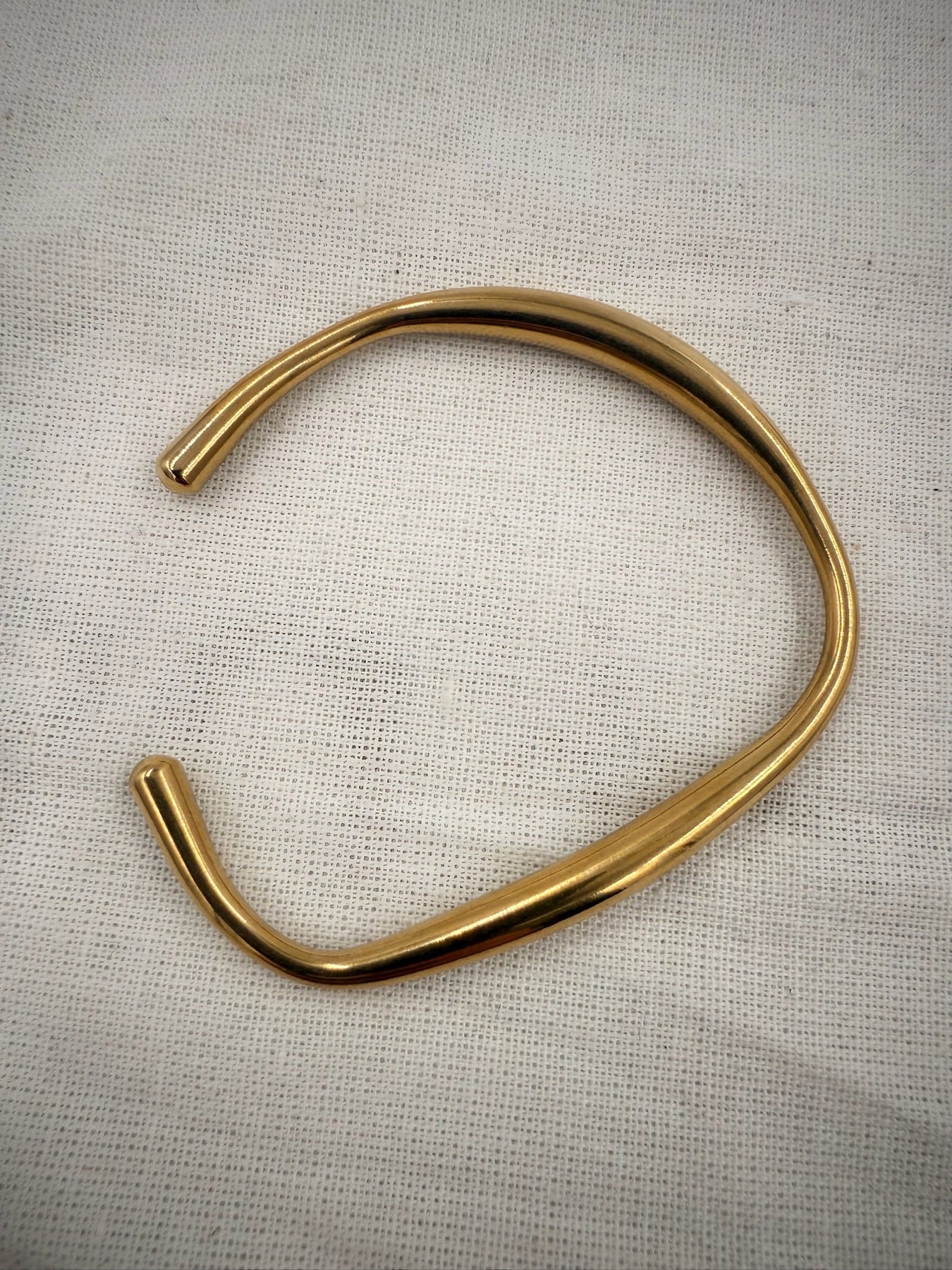 Dette nikkelfri armbånd fra NINE har en 18 karat guldbelægning, der giver et sofistikeret udtryk. Det buede design er skabt til dig, der ønsker et stilrent smykke til hverdagens mange anledninger.