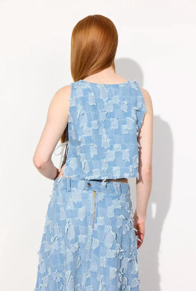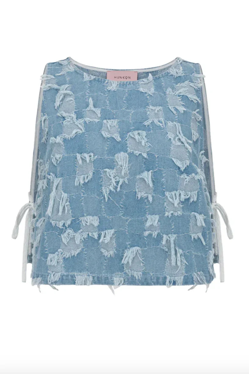Denne Nico-top fra Hunkøn har en denimkonstruktion med patchworktekstur og frynser. Den croppede længde og sideslidserne med bindedetaljer giver mulighed for at tilpasse pasformen.