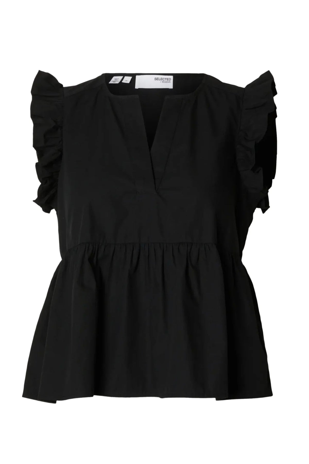 Blair-Ida toppen fra Selected Femme er fremstillet i 100% økologisk bomuld med en løs, behagelig pasform. Den har feminine detaljer som V-udskæring og puffede flæseærmer, mens den sorte farve gør den praktisk i hverdagen.