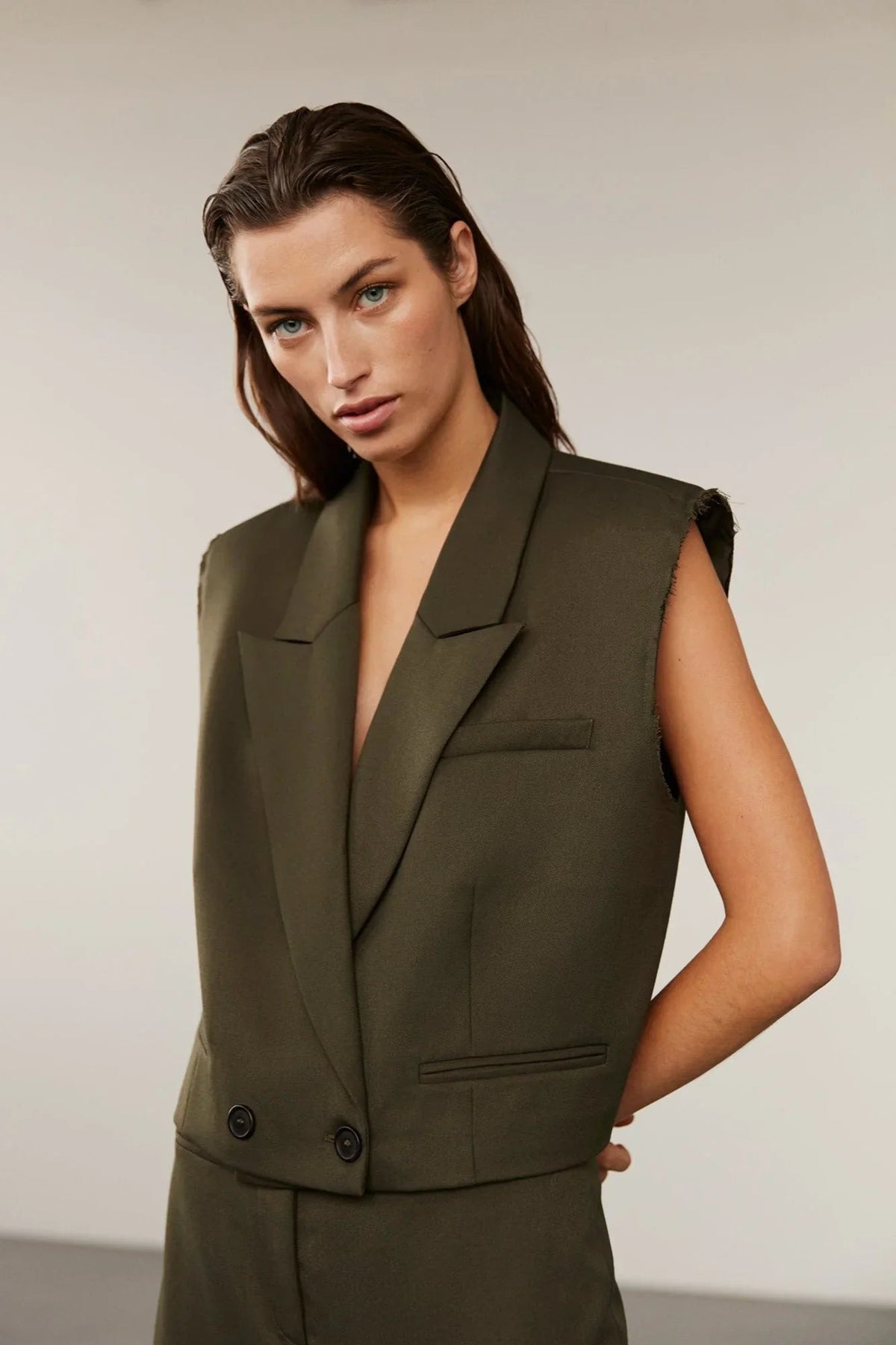 Denne vest fra Sofie Schnoor er et interessant tilføjelse til garderoben. Med sin olivengrønne farve og unikke detaljer præsenterer den et distinkt design. Vesten har en klassisk krave, der giver et velkendt præg, mens dobbeltknaplukningen sikrer en sikker lukning. Et særligt kendetegn er de rå kanter ved skuldrene, som tilfører et moderne twist til det ellers klassiske design. Denne kombination af traditionelle elementer og trendy detaljer gør vesten til et bemærkelsesværdigt stykke tøj.