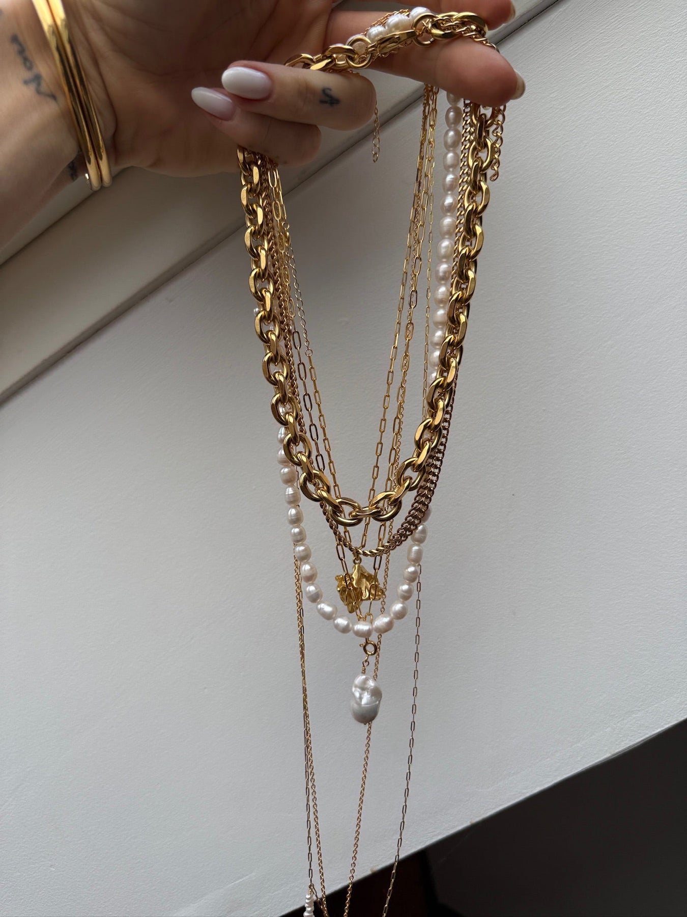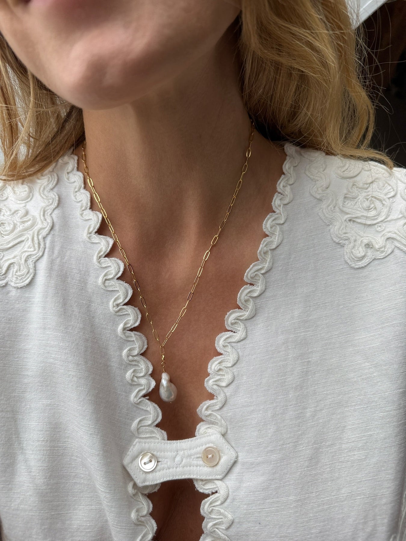 Halskæde i 18 karat guldbelagt messing med store ovale led og en baroque perle som vedhæng.