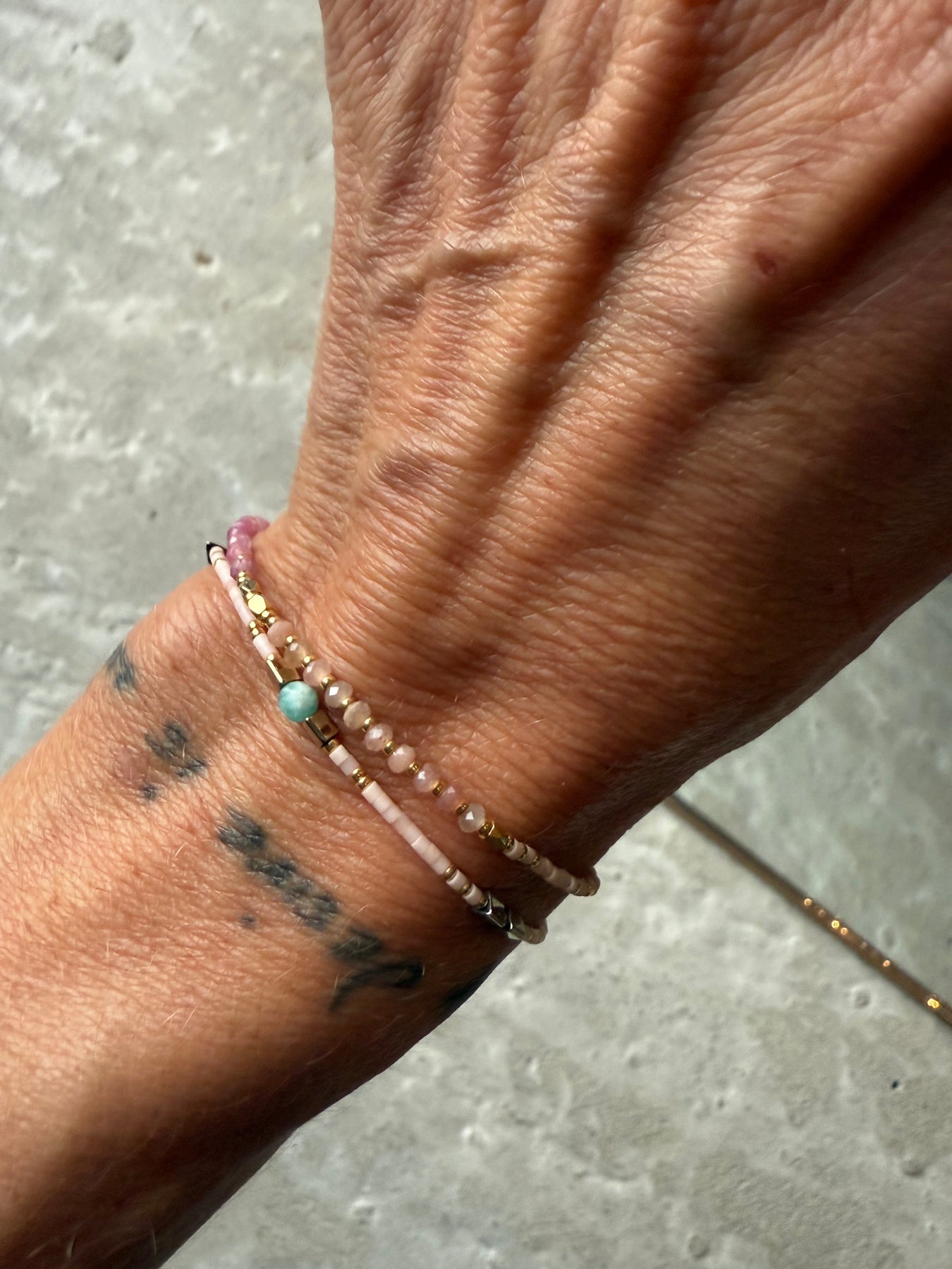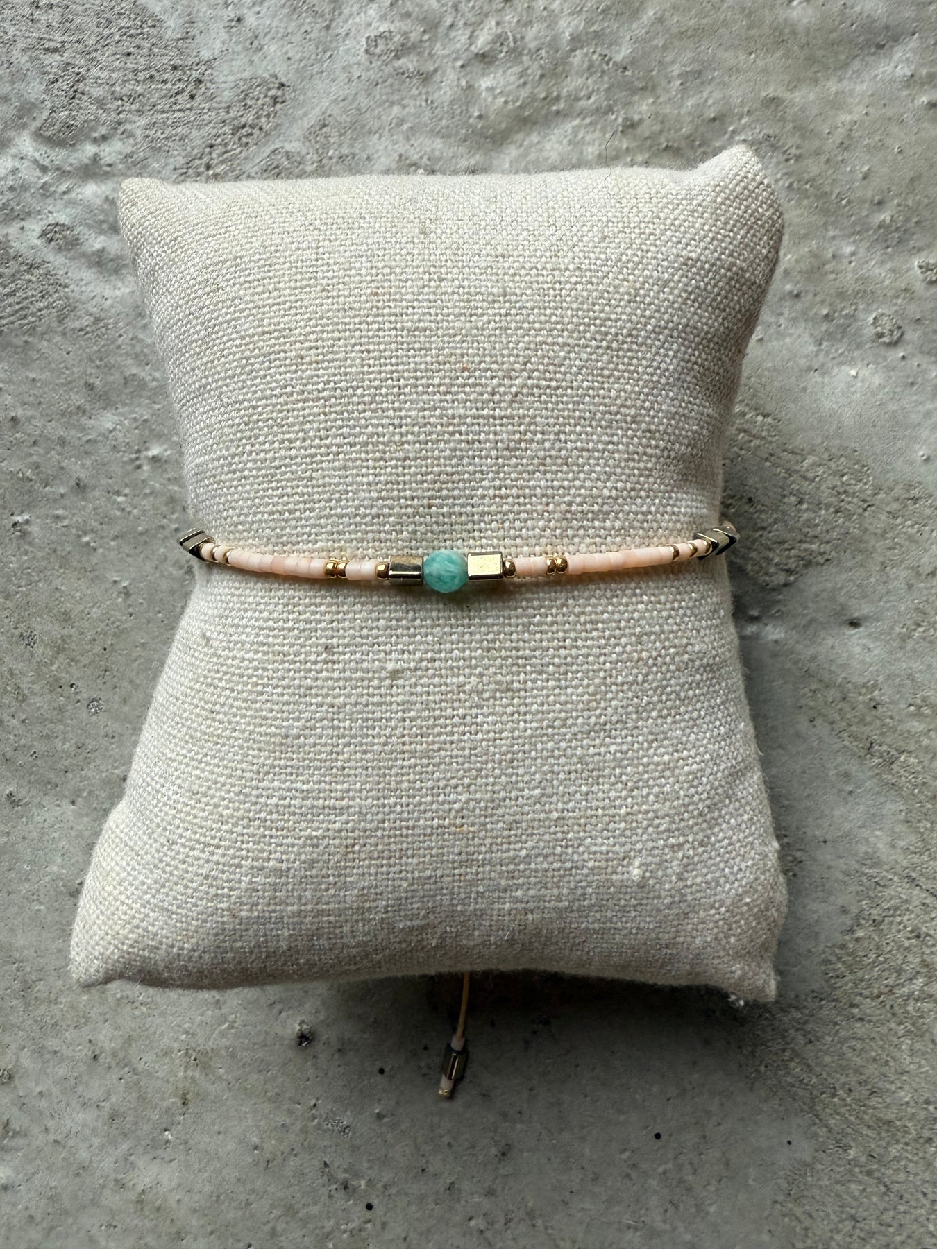 Dette Andcopenhagen-armbånd kombinerer lyserøde perler med gulddetaljer og en karakteristisk turkis perle. Den justerbare knudelukning gør det nemt at tilpasse armbåndet til dit håndled.