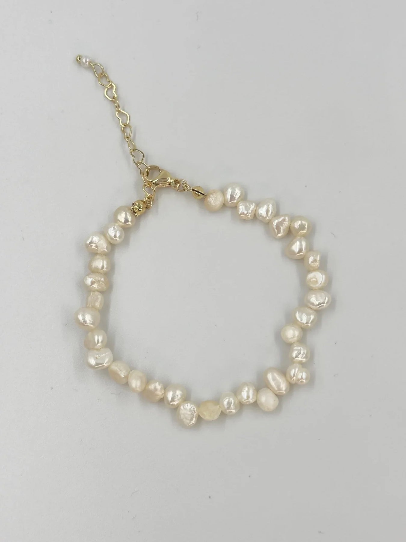 Dette Andcopenhagen Aura-armbånd kombinerer ægte ferskvandsperler i naturlige variationer med små hjertedetaljer. Den justerbare kæde afsluttes med en perle og sikrer en god pasform.