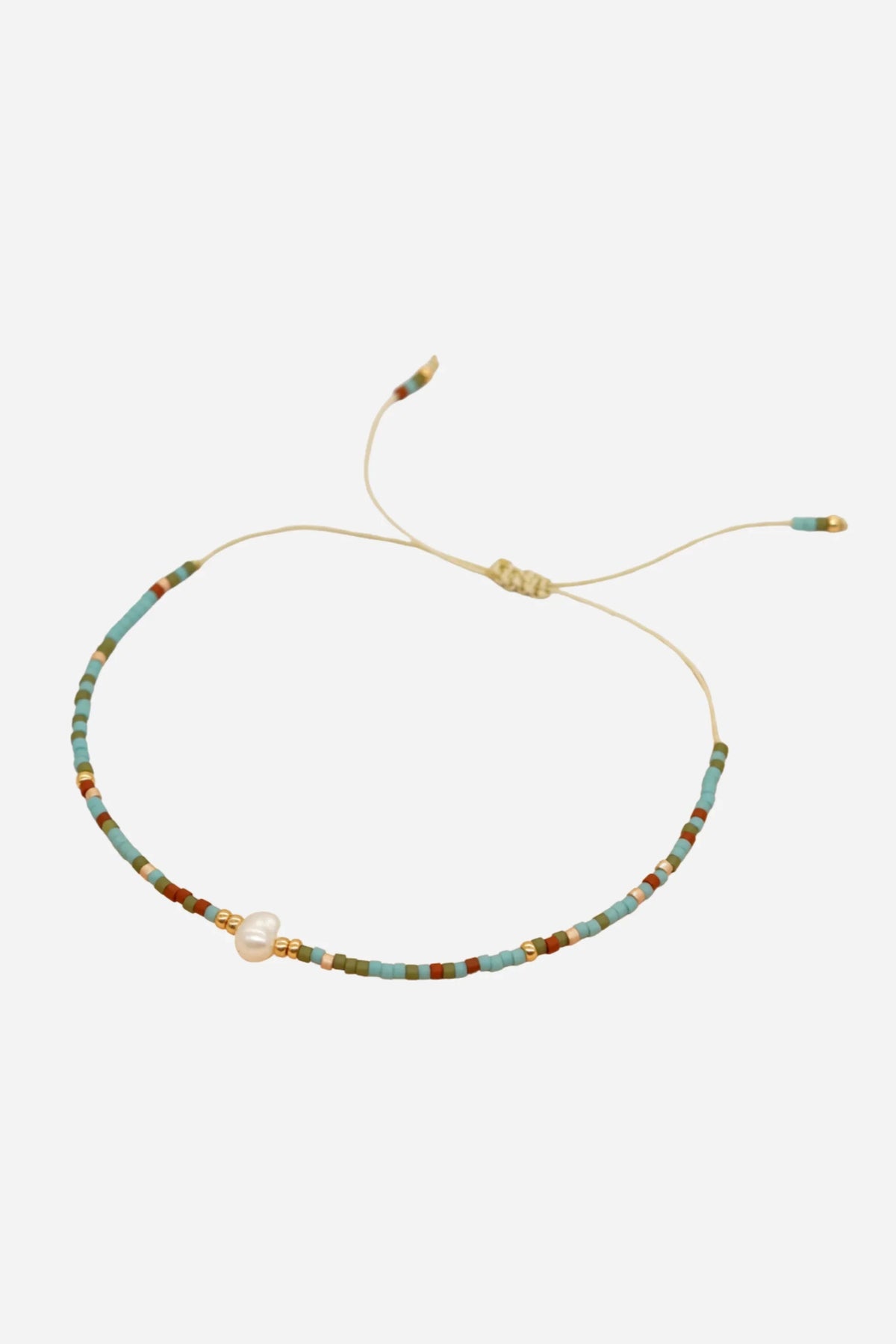 Stilfuldt armbånd fra Andcopenhagen med blå, brune og khaki perler. Den harmoniske farvekombination gør det nemt at matche med hverdagsoutfits. Den justerbare knudelukning sikrer en behagelig pasform hele dagen.