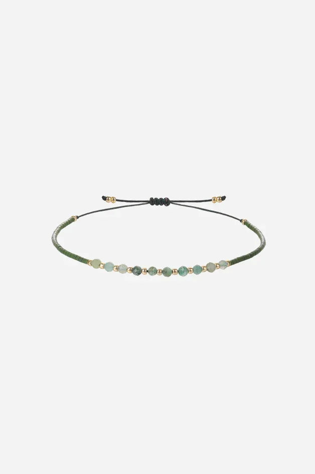 Andcopenhagen perlearmbånd med grønne glasperler og gyldne detaljer. Den justerbare knudelukning giver en fleksibel pasform, mens den holdbare nylonsnor sikrer lang levetid.