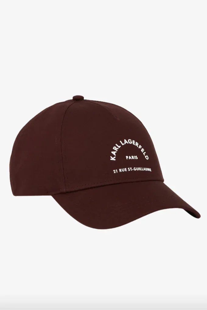 Burgundy kasket med hvid Karl Lagerfeld Paris-branding. Den buede skygge giver god solbeskyttelse, mens sekspanelskonstruktionen sikrer en behagelig pasform til park- og kaffebesøg.