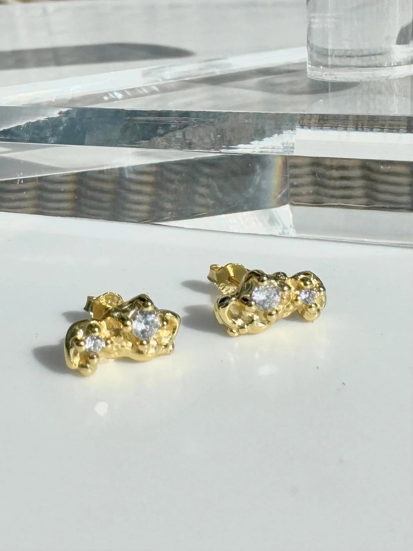 Andcopenhagen Amelie ørestikker med organisk form og to klare sten. Dobbeltbelagt for øget holdbarhed og fremstillet med 18 karat guldbelægning, der giver en varm glød til festlige anledninger.
