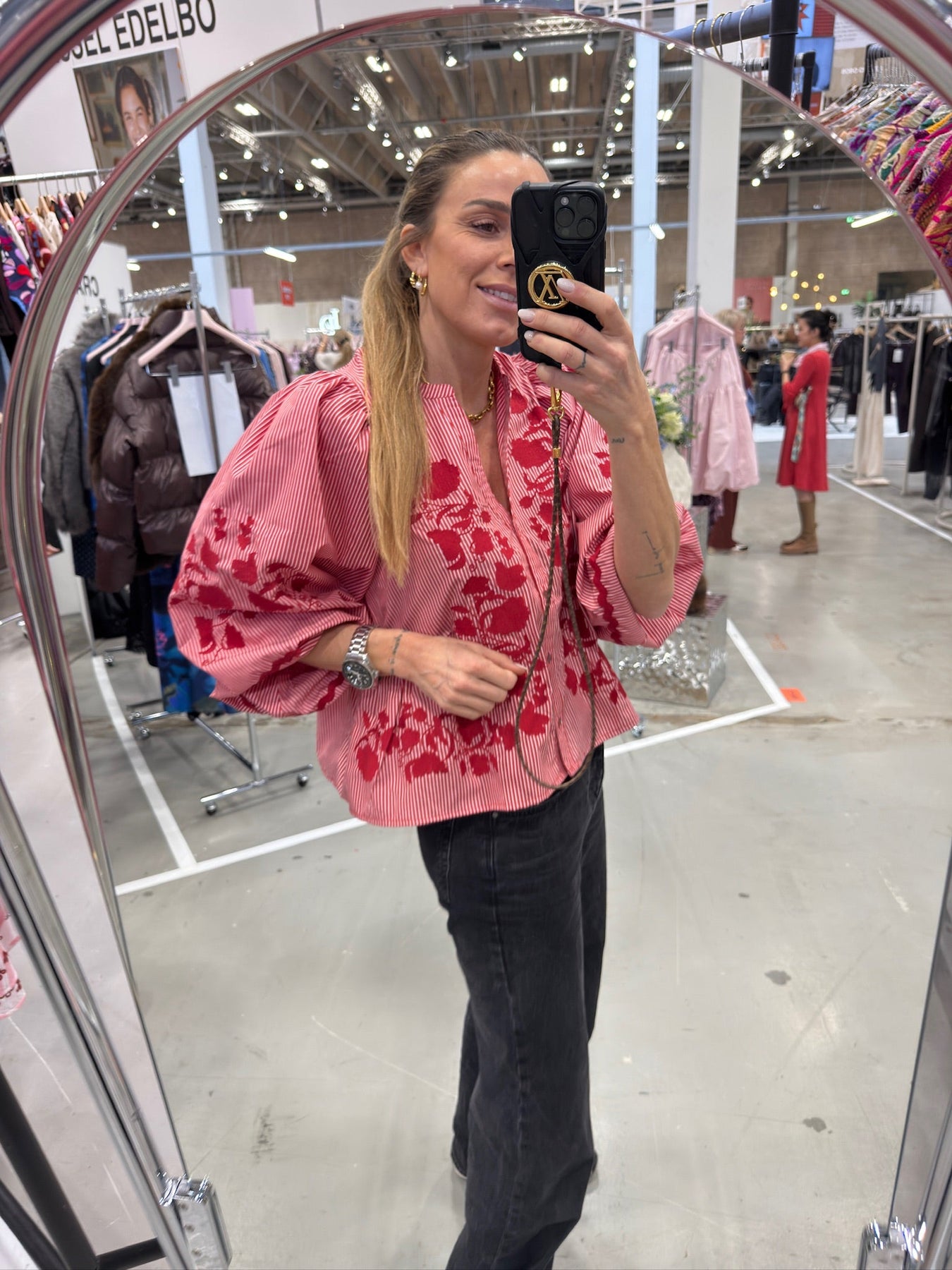 Blusen er konstrueret med indsatte paneler i både for- og bagstykke, som danner bløde rynker og giver en smigrende form omkring livet. De store ballonærmer tilfører volumen og er samlet ved håndleddet med skjult elastik for en behagelig pasform. Som ekstra detaljer er den dekoreret med zig-zag bånd og ensfarvet, fint blomsterbroderi, placeret dekorativt langs fronten og på ærmerne.