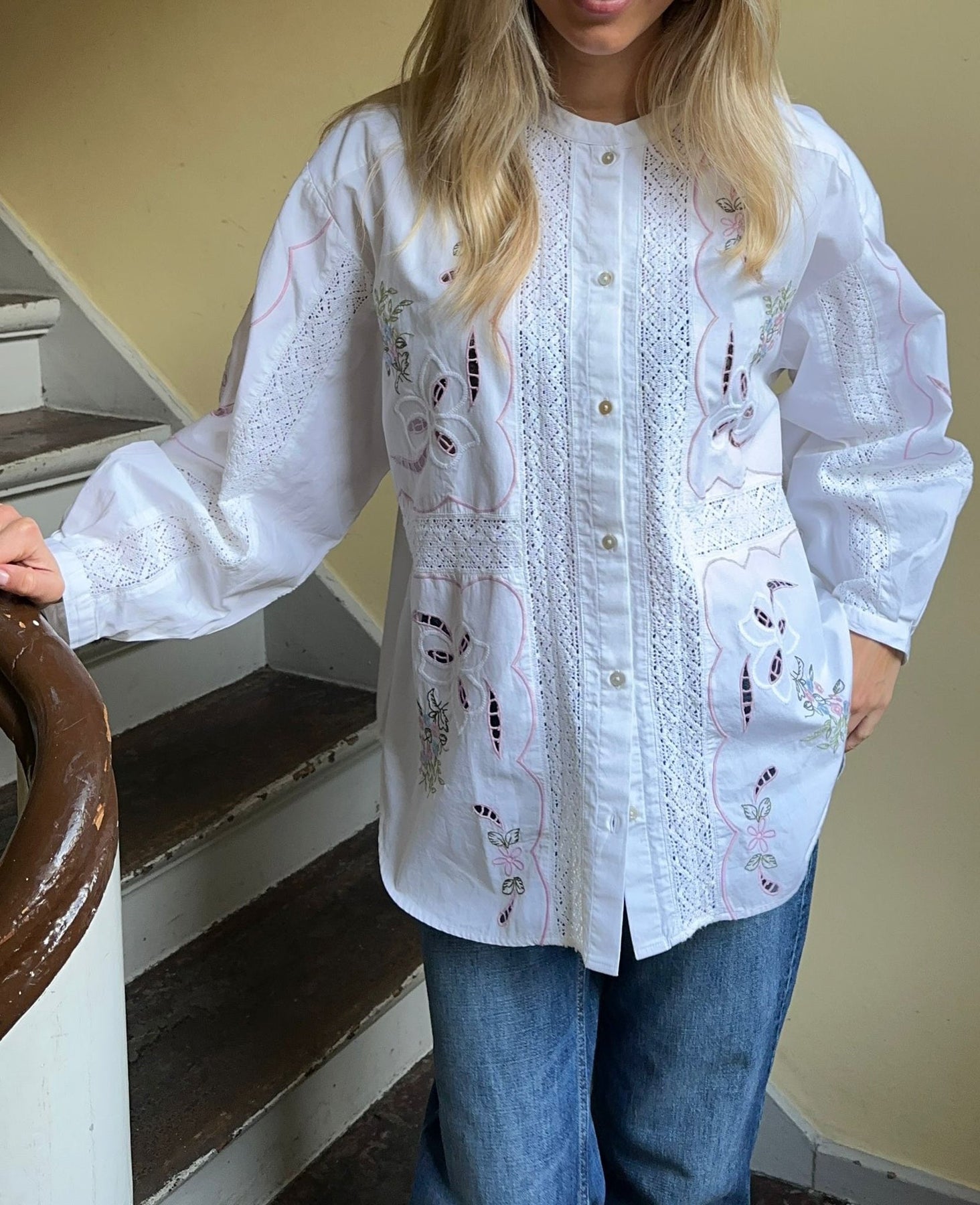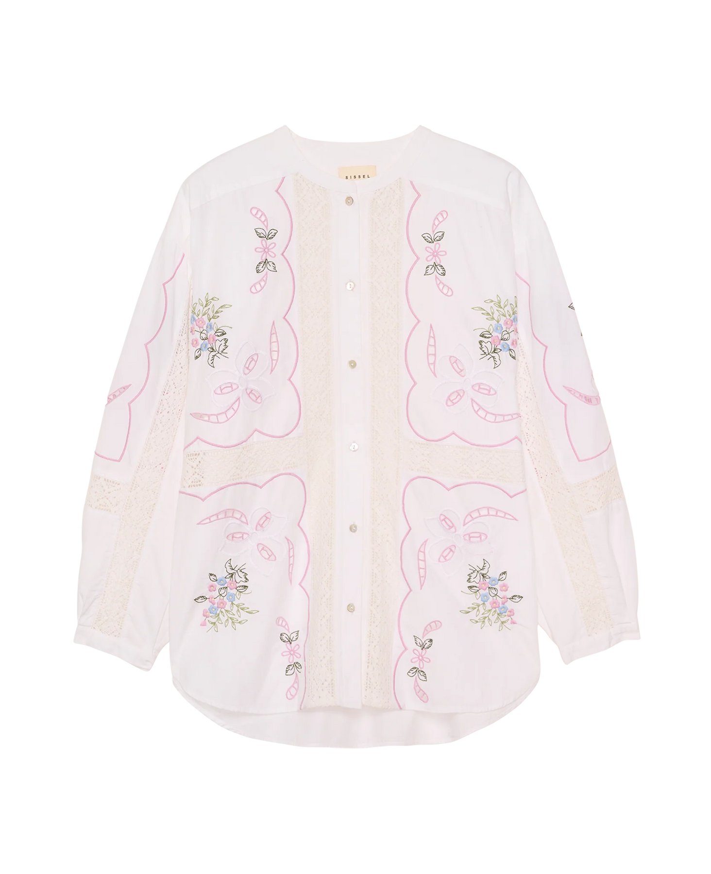 Skjorten er udsmykket med stemningsfulde broderier inspireret af en gammel, vintage dug og fremhævet med dekorative blondebånd, som tilfører et poetisk og håndlavet præg.