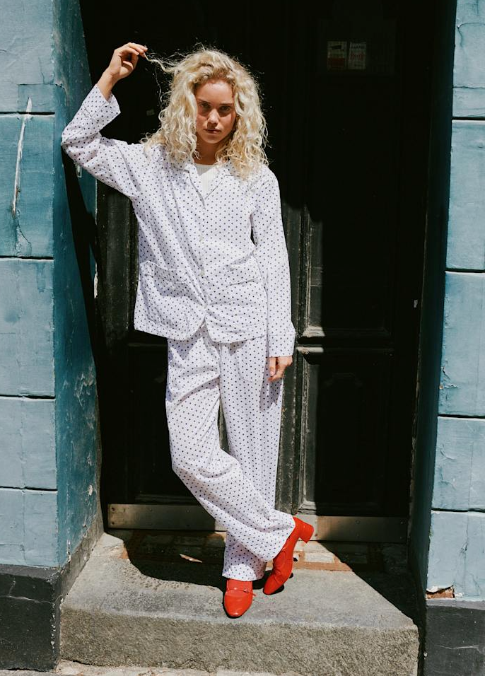 Dette nattøjssæt fra Sissel Edelbo er fremstillet i 100 % økologisk bomuld, der giver dig en blød og åndbar fornemmelse mod huden. Sættet har et karakteristisk bloktryk med navy prikker og praktisk knaplukning.