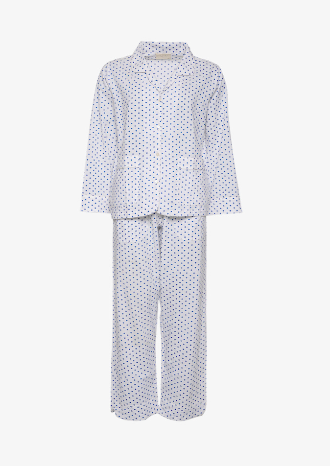 Hvid nattøjssæt med marineblå prikker, langærmet skjorte og bukser.