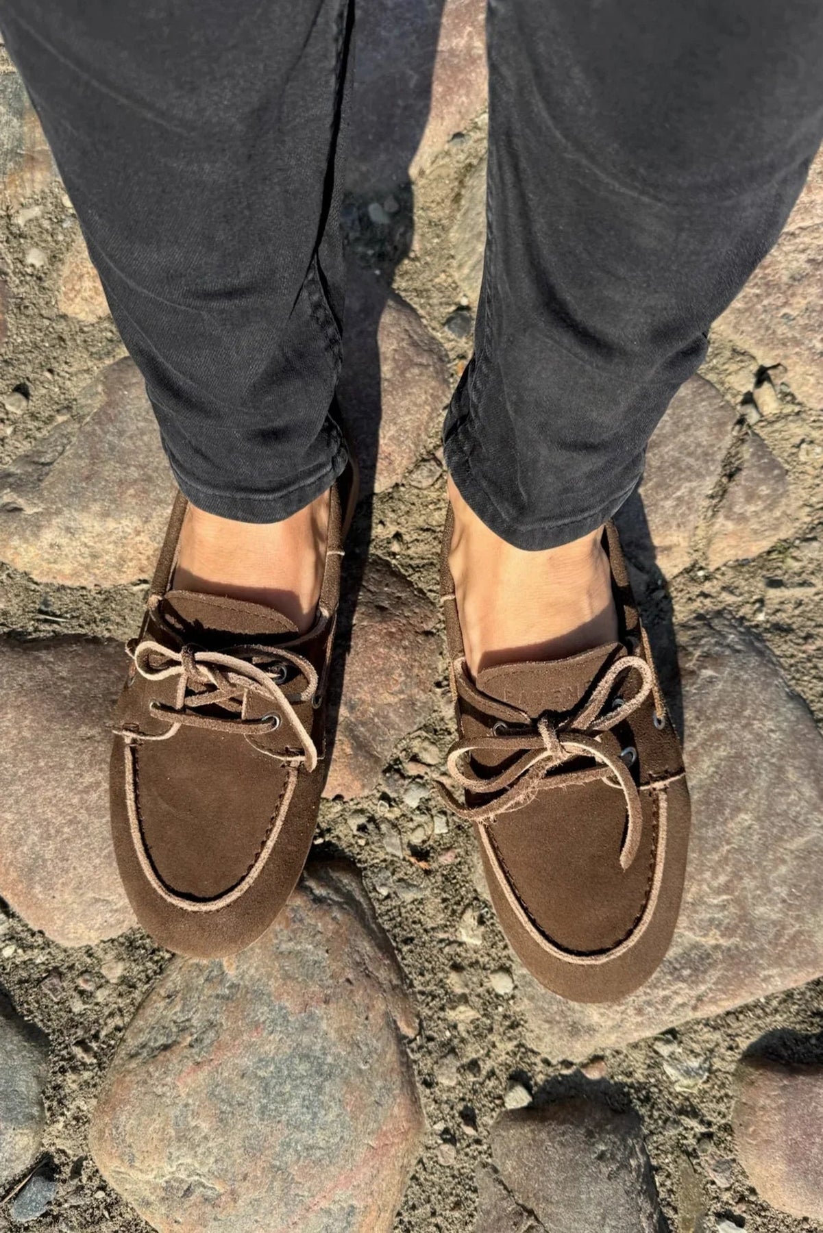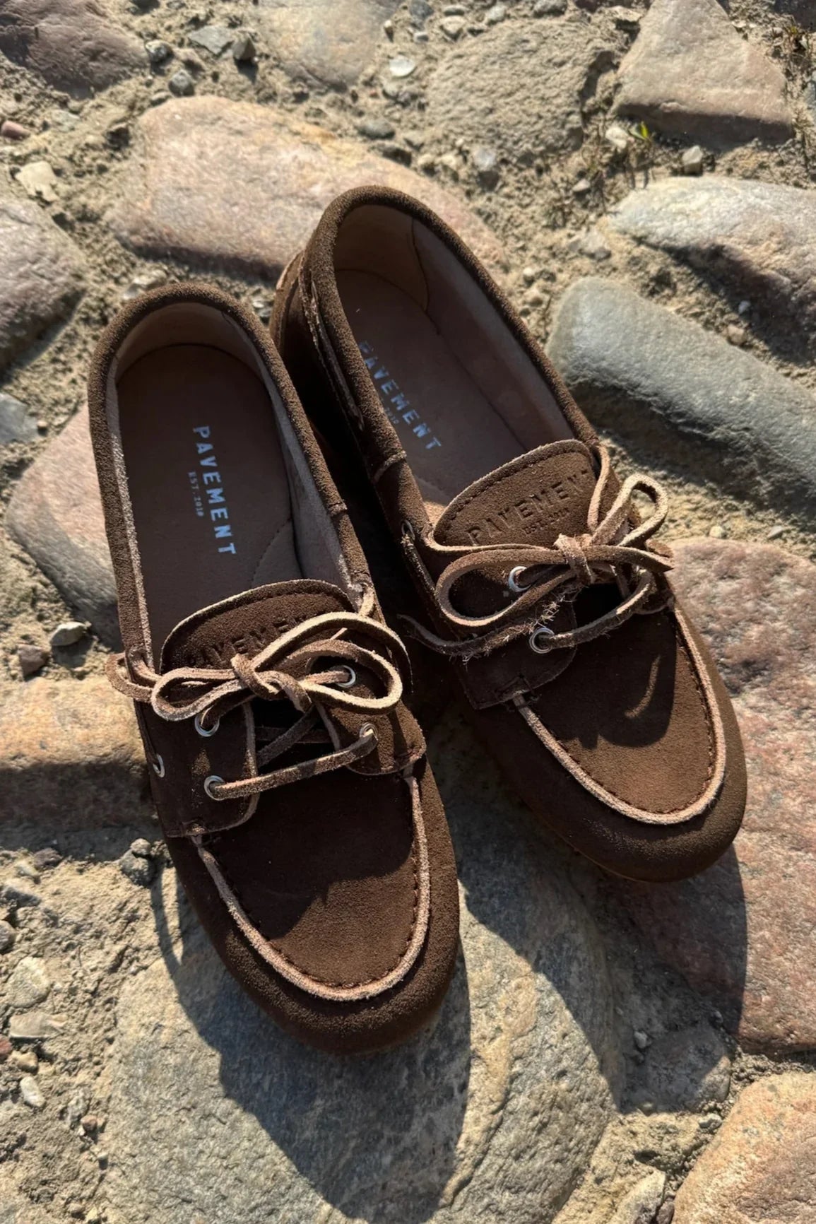 Disse brune loafers fra Pavement er fremstillet i blødt ruskind, der former sig efter din fod. Gummisålen giver godt greb på forskellige underlag, hvilket gør dem ideelle til lange gåture og ærinder.