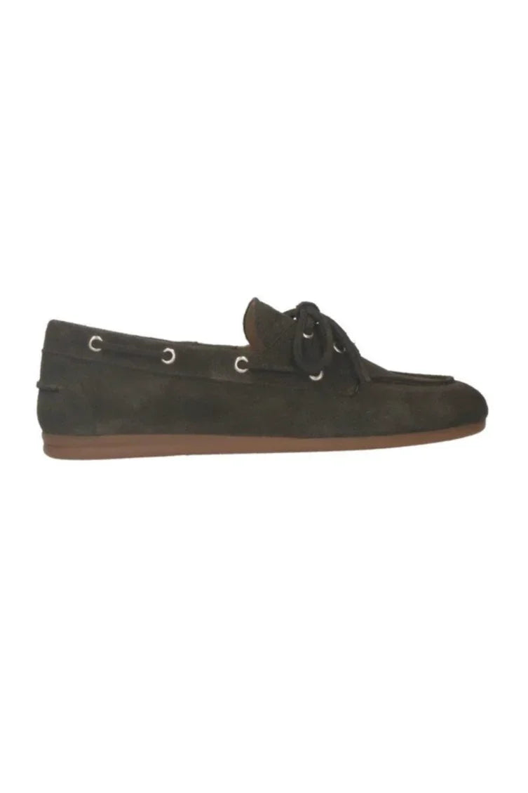 Mørkegrøn ruskindsloafer med afrundet tå, snøredetalje og lav brun sål.