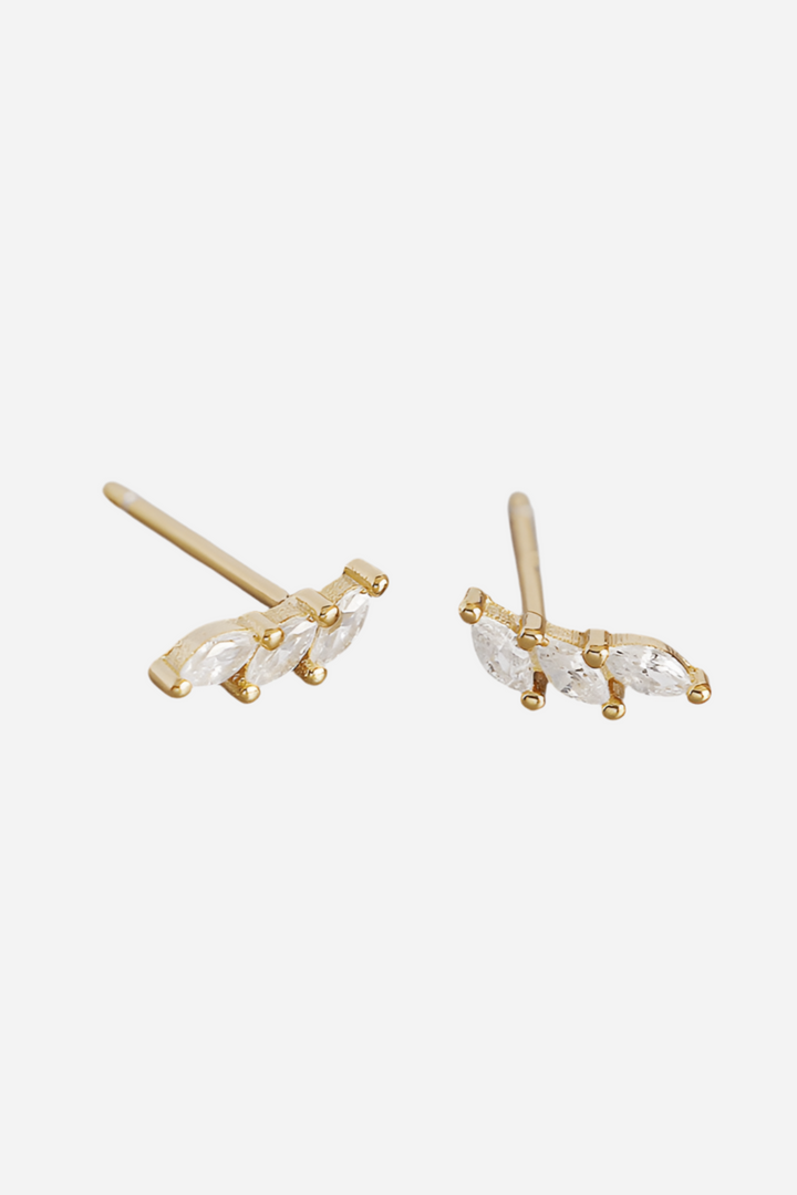 Disse 8 mm ørestikker fra Andcopenhagen har tre marquise-formede sten, der skaber et moderne udtryk. De er fremstillet i 18 karat guldbelagt sterlingsølv, som giver et varmt skær til både hverdag og fest.
