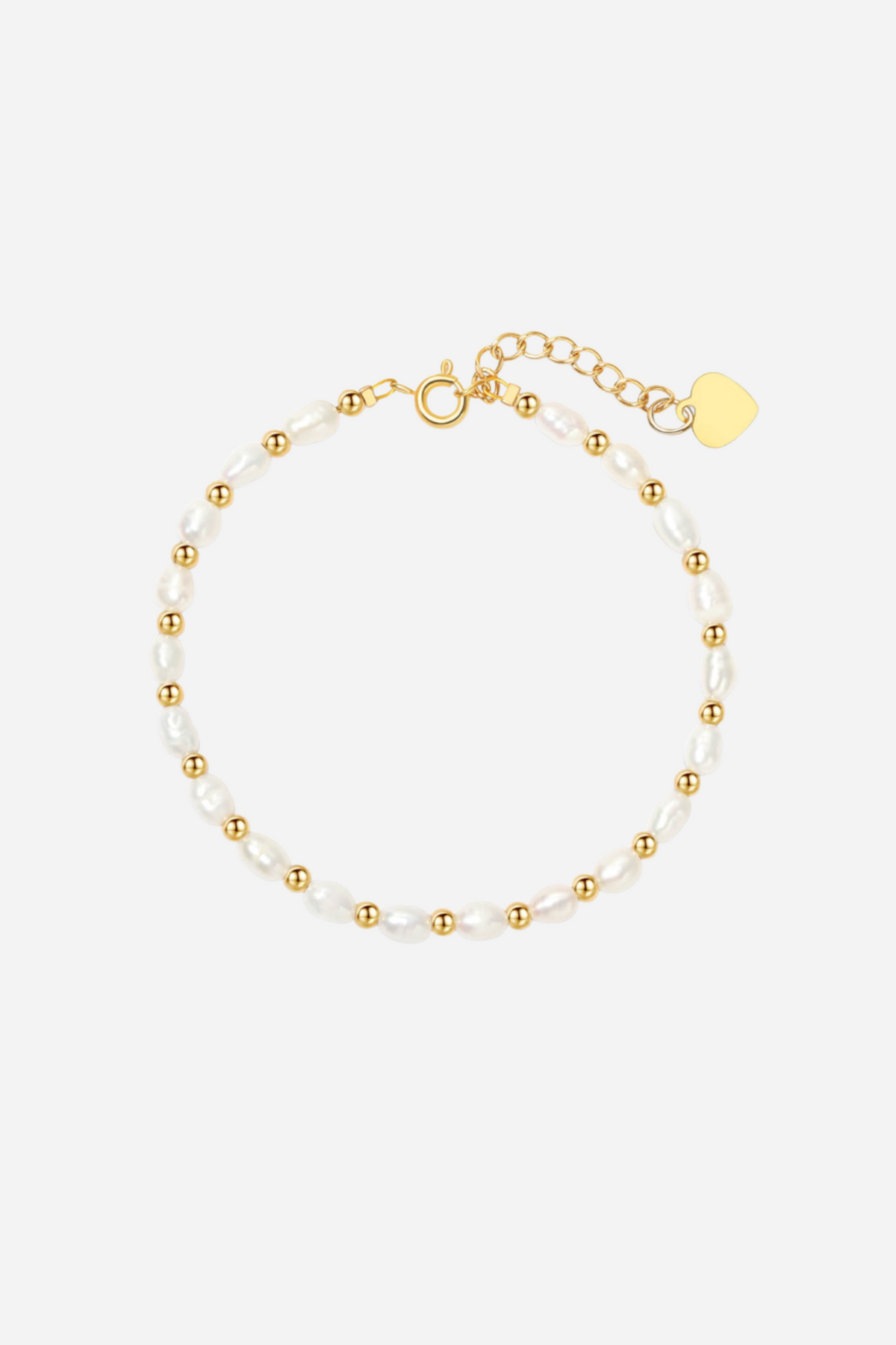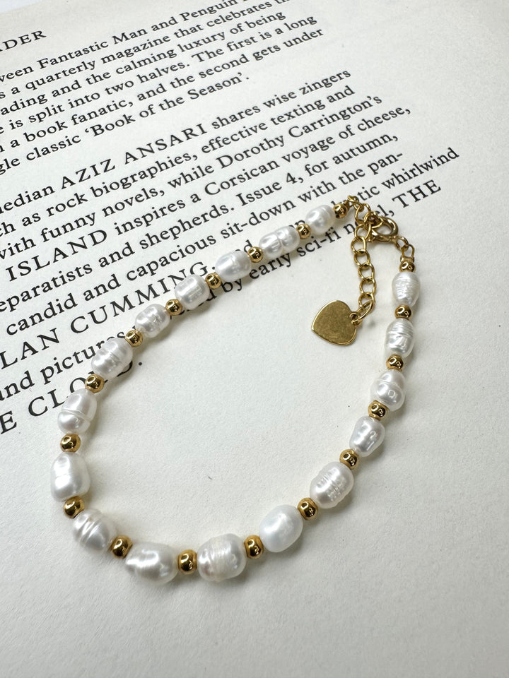 Armbånd med hvide og guldbelagte perler i skiftevis mønster, med justerbar kæde og hjertevedhæng.