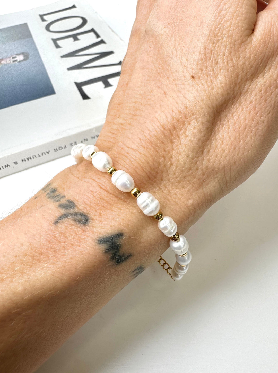 Early Pearly armbånd fra Andcopenhagen kombinerer ægte perler med guldbelagte perler i et varieret mønster. Armbåndet har justerbar længde fra 16,5 til 22,4 cm og passer til både hverdag og fest.