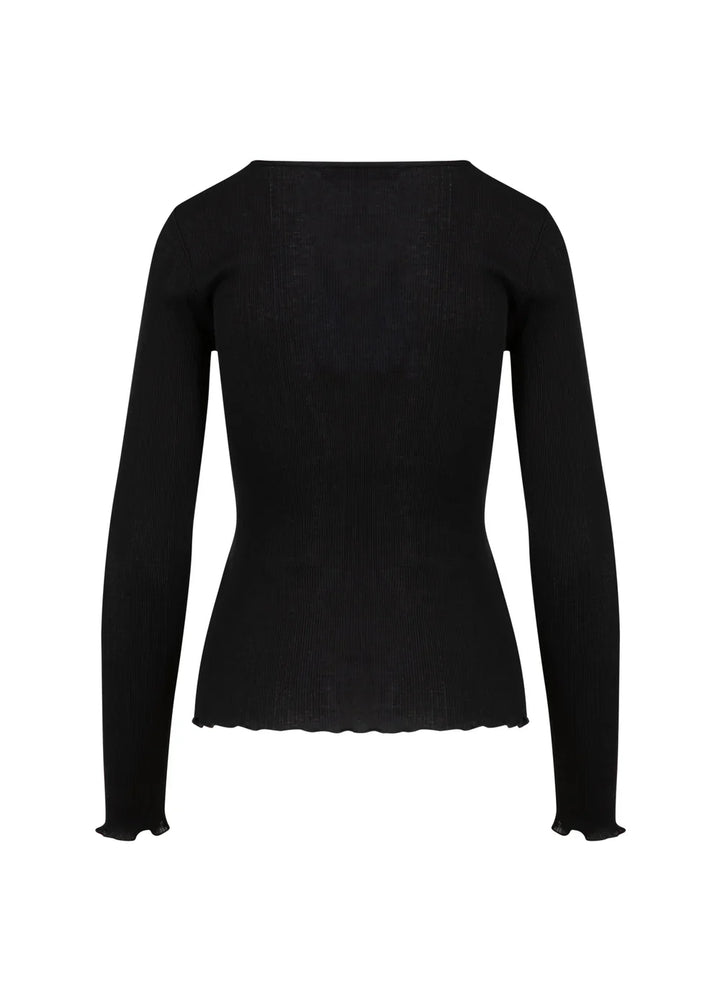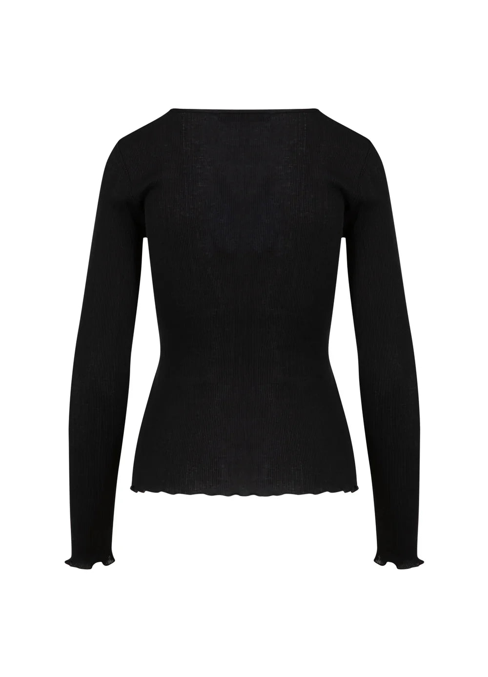 Sort bluse med tætsiddende silhuet, rund halsudskæring, lange ærmer og let bølget kant.