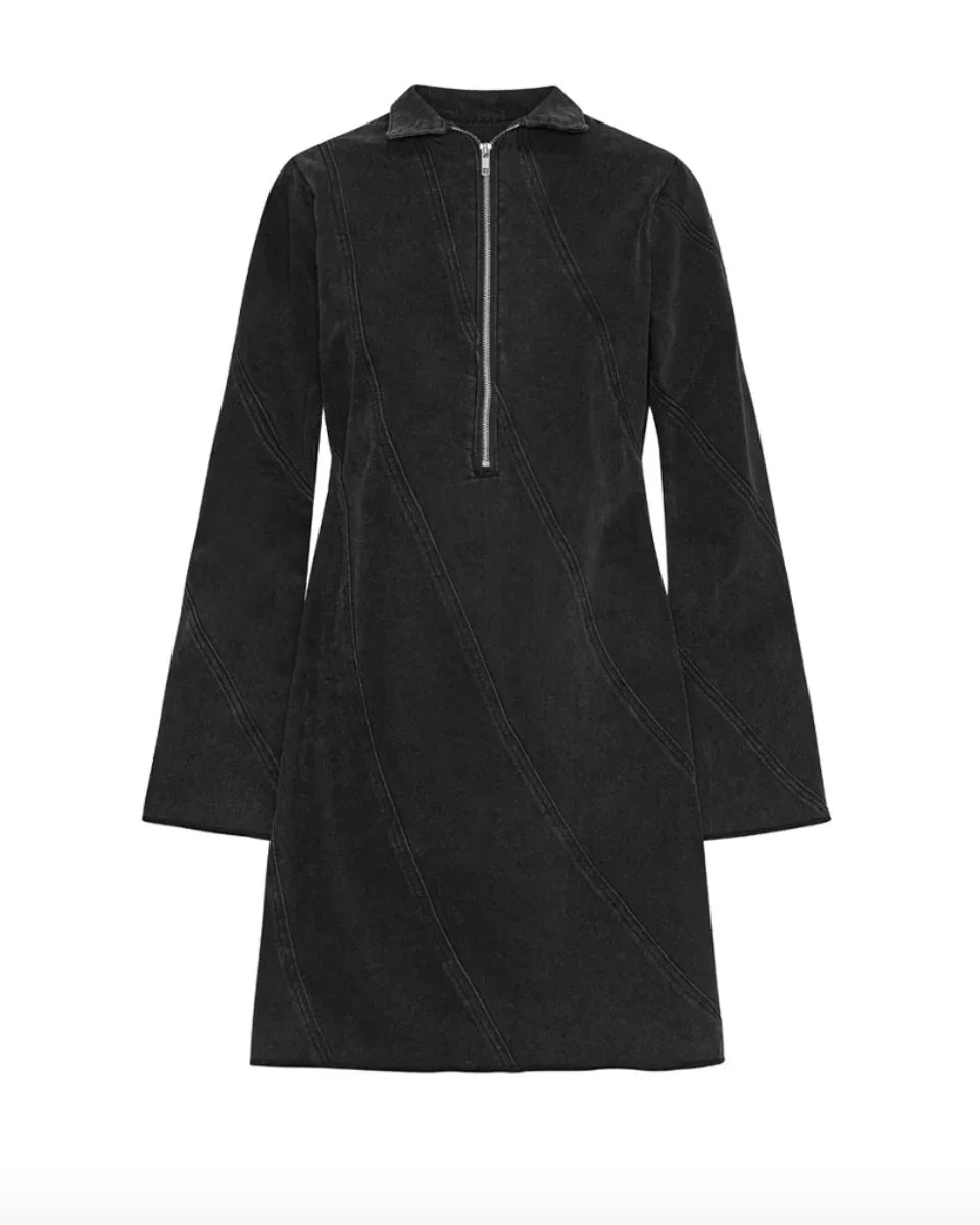 Hunkøn - Kjole - Grå denim - Mette er en kort bodycon kjole i sortvasket bomuldsdenim. Denne ikke-strækbare kjole har en tætsiddende silhuet og er designet med fokus på detaljer. De skrå, synlige sømme, der løber hele vejen rundt om kroppen og ærmerne, tilføjer et særligt visuelt element til kjolens design. Mette-kjolen er skabt til kvinder, der værdsætter kvalitet og stil i deres garderobe.