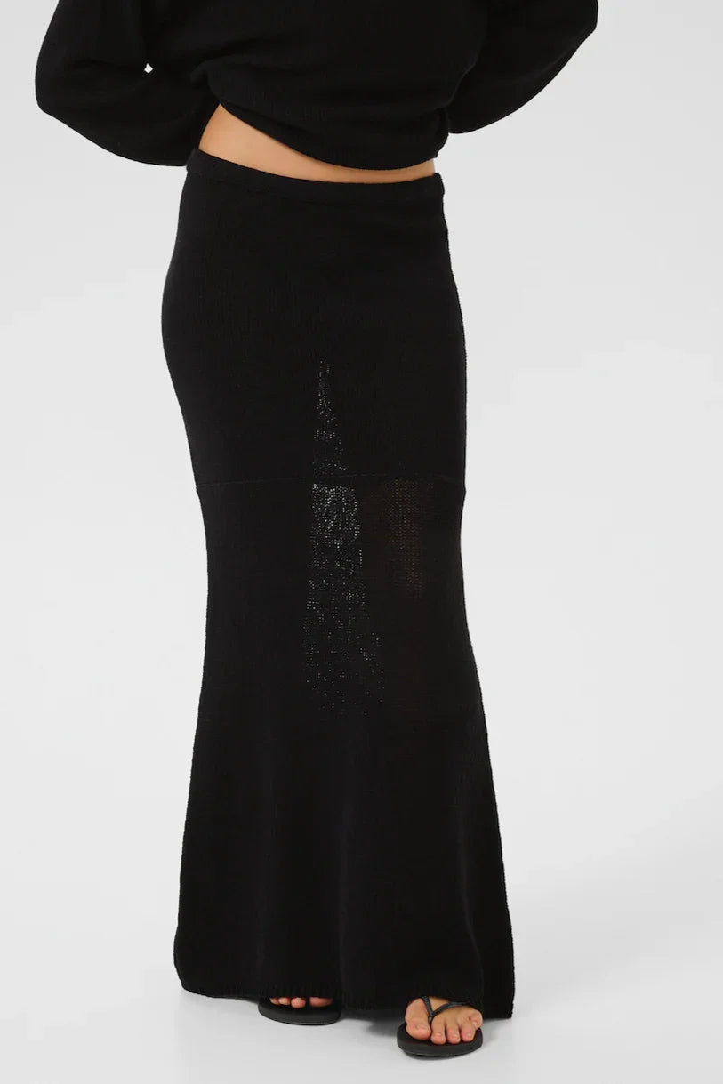 Denne sorte nederdel fra My Essential Wardrobe har en tilpasset pasform øverst og en udvidende silhuet nedadtil, der går helt ned til fødderne. Den strikkede bomulds- og hørblanding giver god bevægelsesfrihed og er velegnet til både hverdag og særlige anledninger.