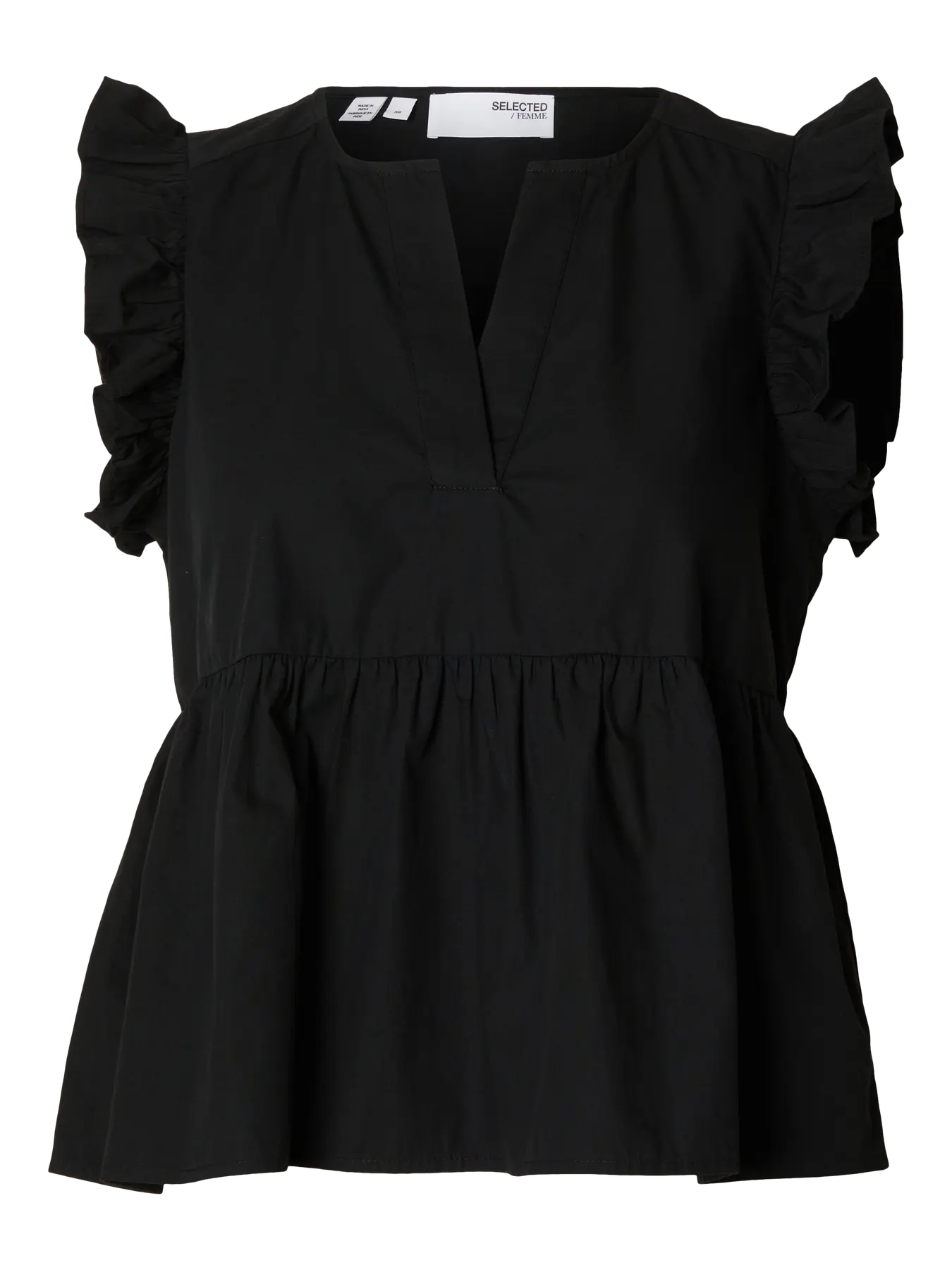 Blair-Ida toppen fra Selected Femme er fremstillet i 100% økologisk bomuld med en løs, behagelig pasform. Den har feminine detaljer som V-udskæring og puffede flæseærmer, mens den sorte farve gør den praktisk i hverdagen.