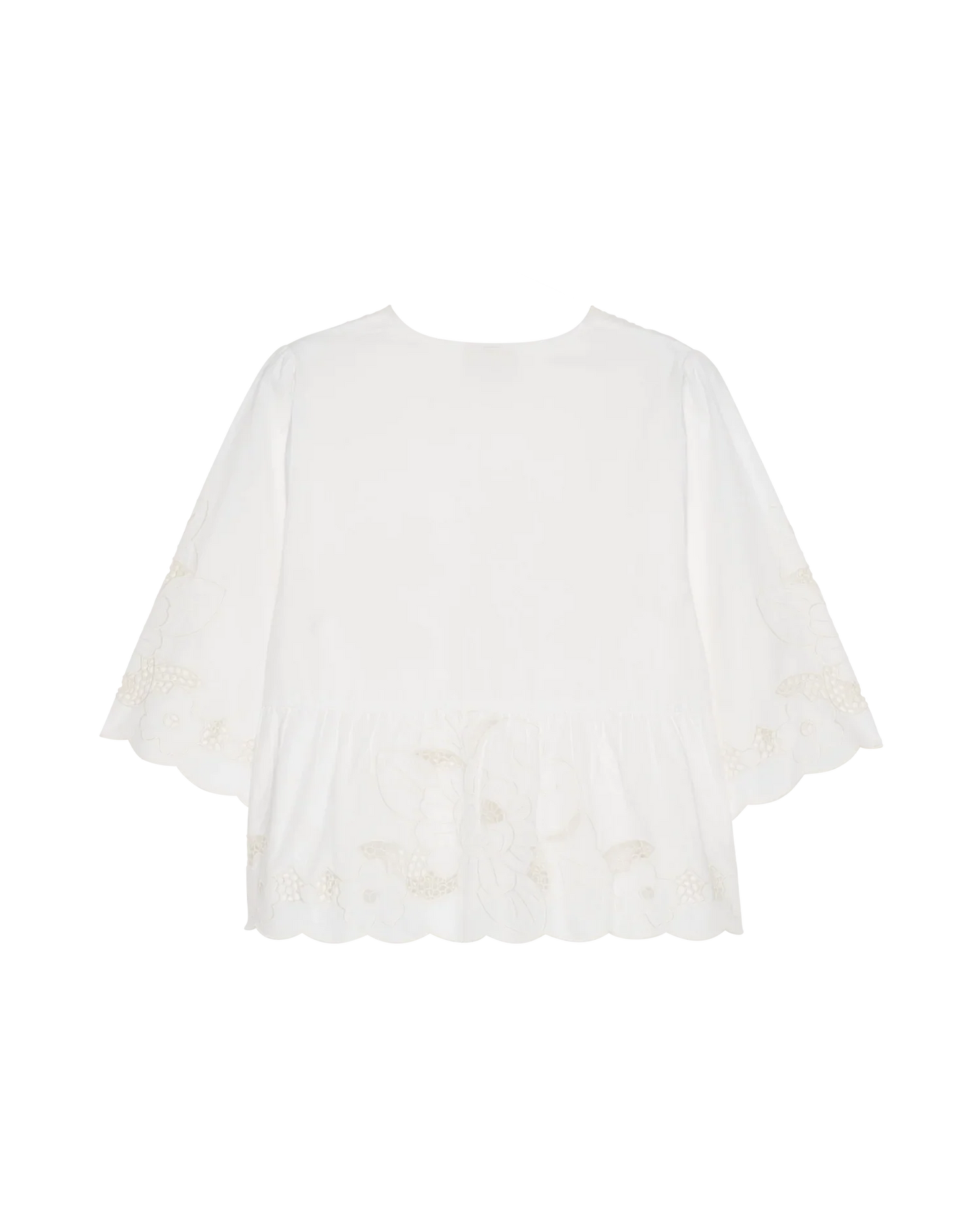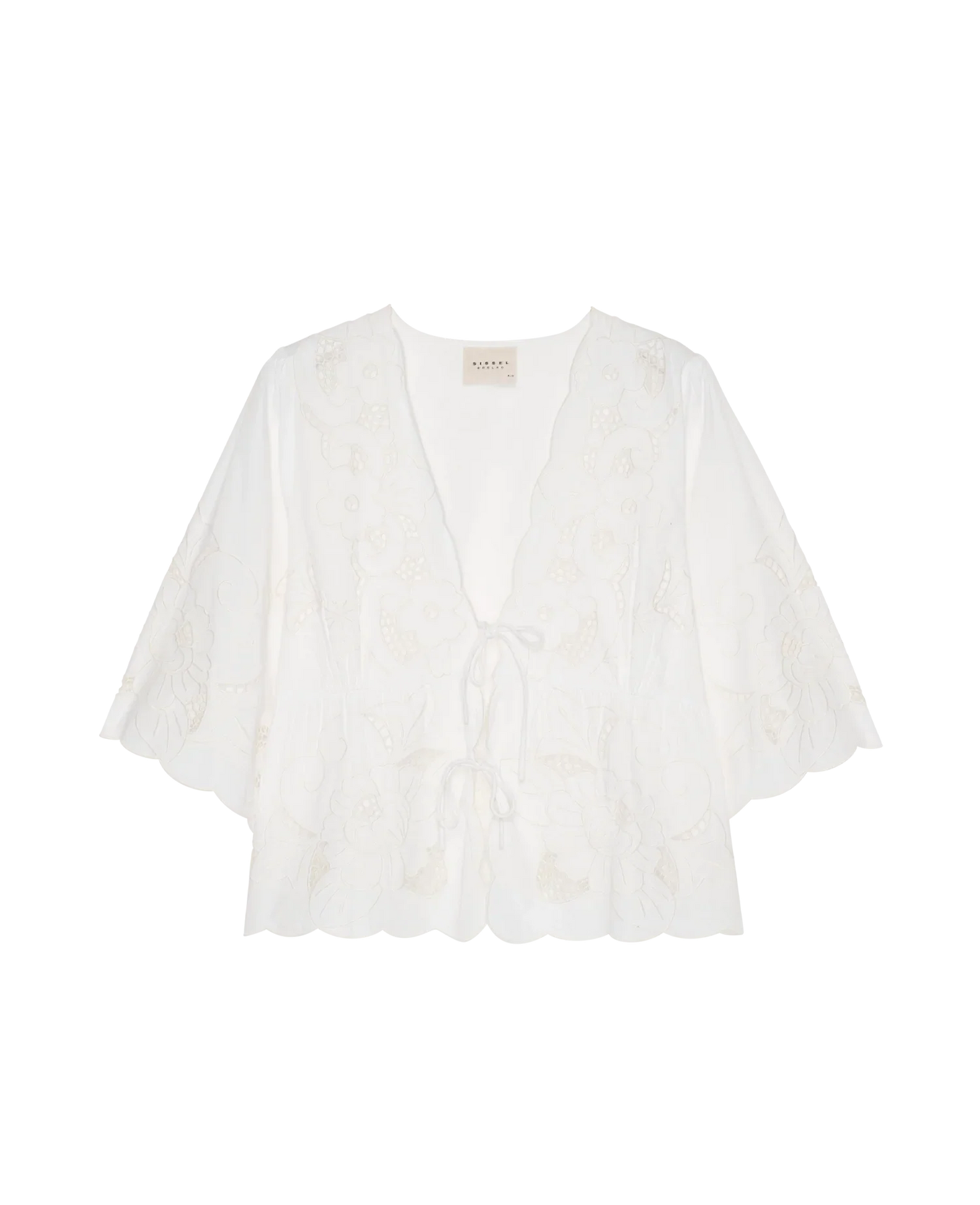 De brede ærmer i albuelængde har lette rynk ved skuldrene, mens den dybe V-udskæring foran og de to sæt bindebånd giver et elegant og ubesværet look. Ideelt så man kan vise sin halskæde. Det tone-i-tone broderede cutwork, inspireret af en vintage dug, tilfører struktur og karakter, og de bølgede kanter fuldender det delikate udtryk.